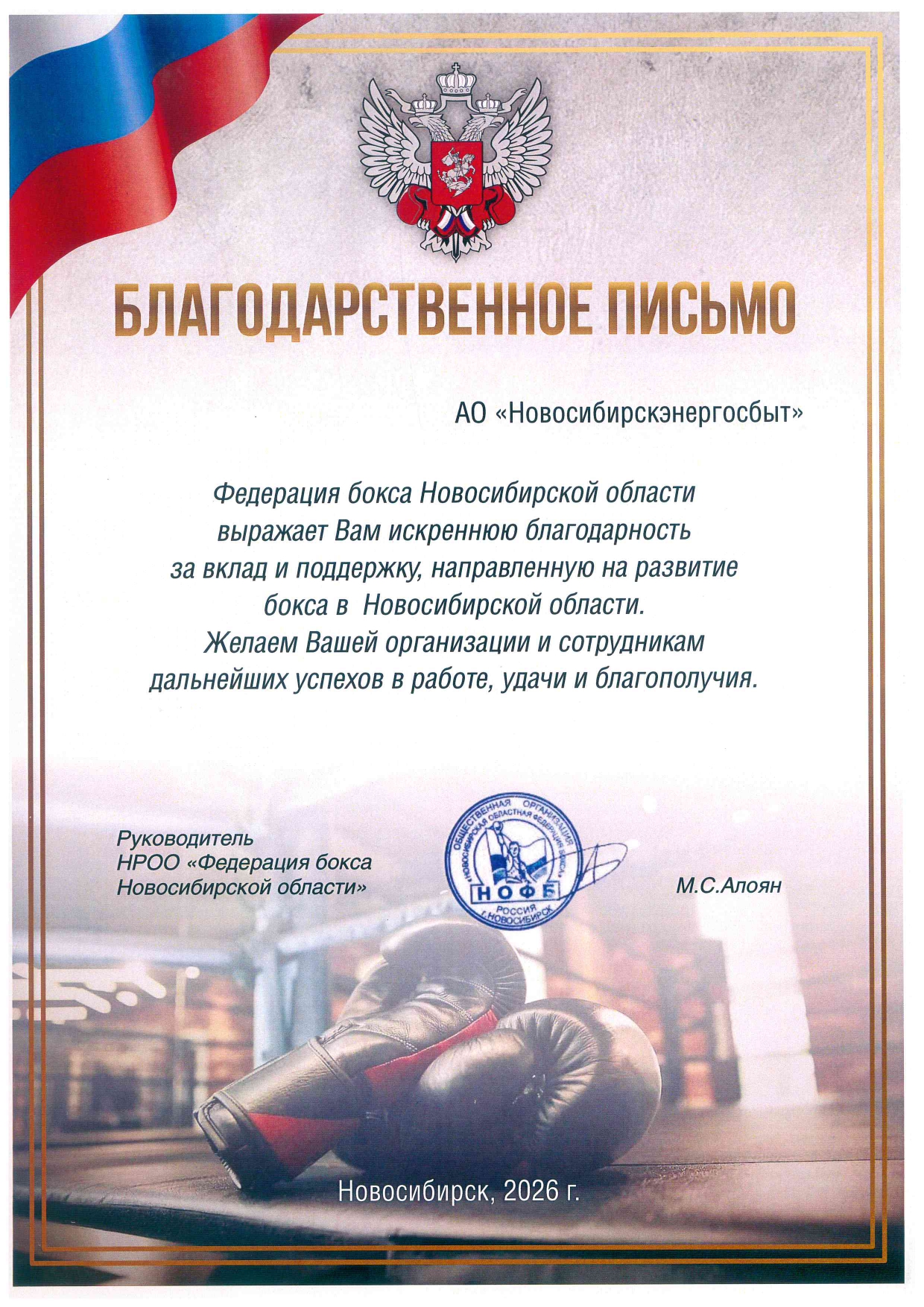 Благодарственное письмо от Федерации бокса за вклад и поддержку, направленную на развитие бокса Новосибирской области