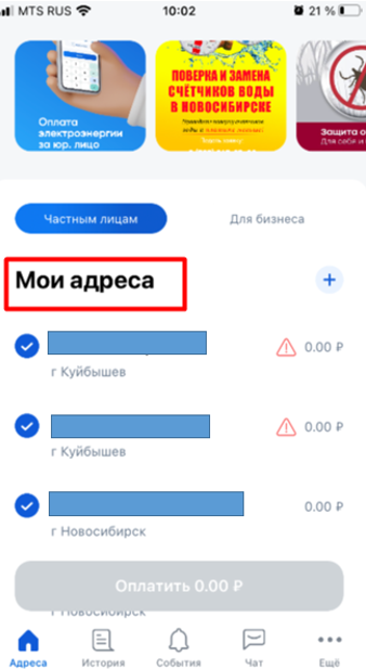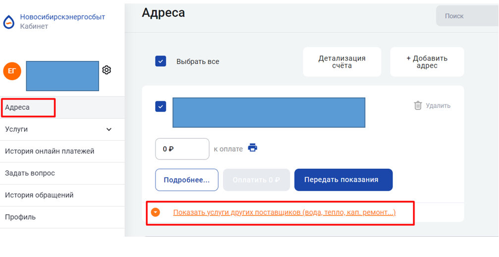 или в Личном кабинете в разделе «Адреса» / «Показать услуги поставщиков (вода, тепло, кап.ремонт…)»