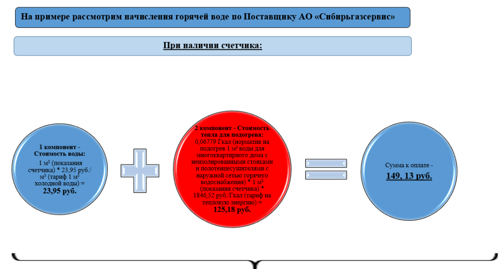 Стоимость 1 м3 горячей воды составляет: 23,95 руб. + 125,18 руб. = 149, 13 руб.