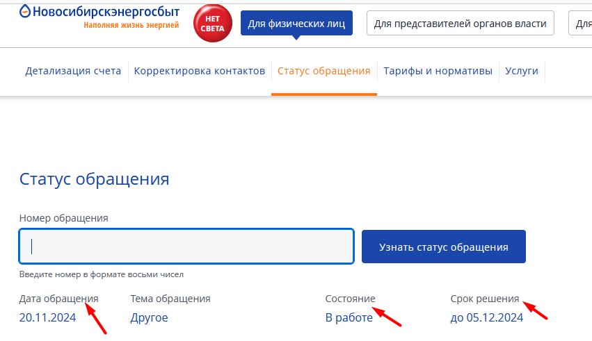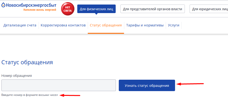 Необходимо внести номер обращения в формате восьми чисел, нажать "Узнать статус обращения":
