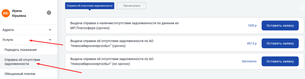 Перейдите в раздел "Услуги"/ "Справка об отсутствии задолженности", заполните все поля, укажите текущие показания счетчика, узнайте задолженность.