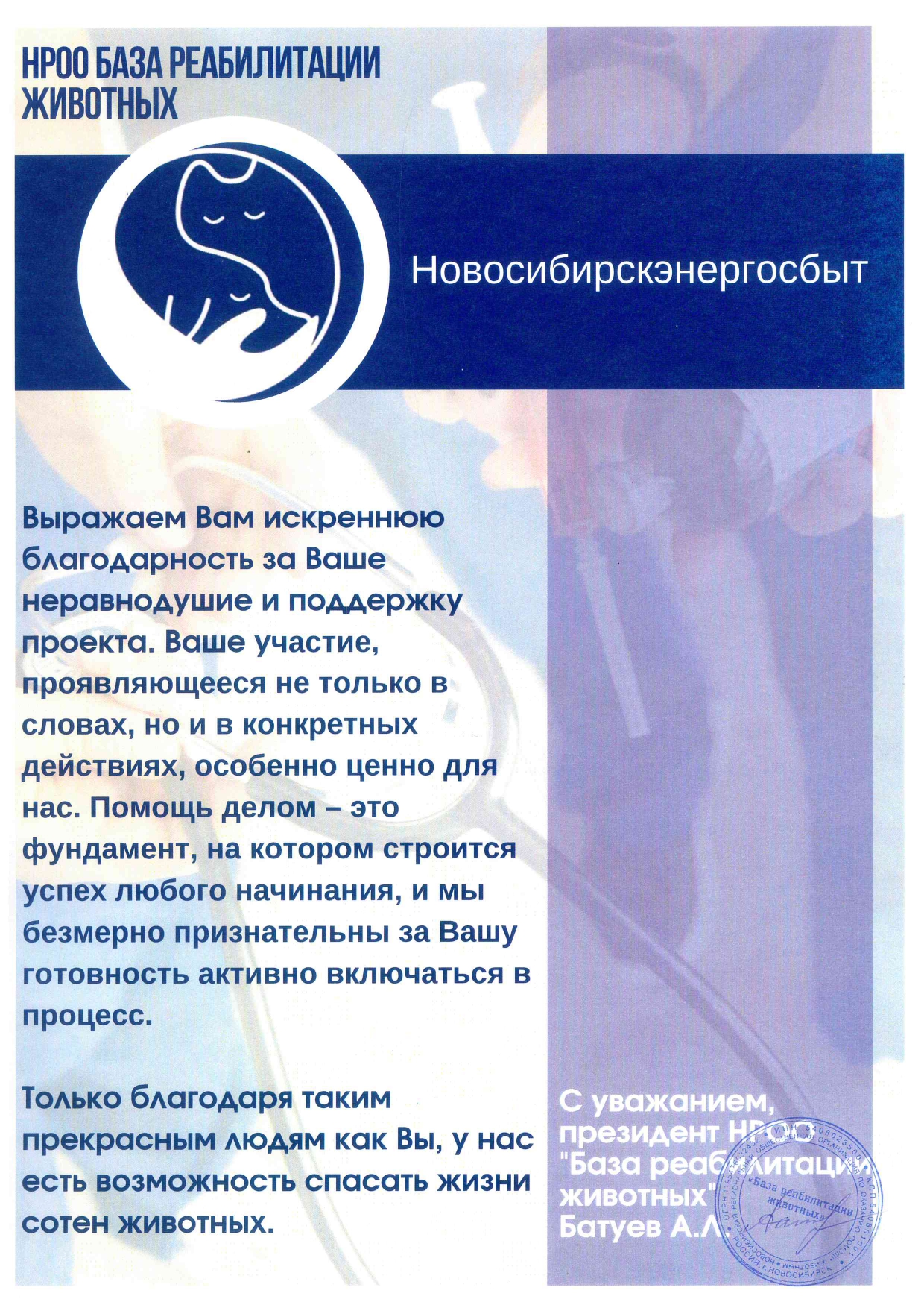 Команда НРОО "База реабилитации животных" г.Новосибирск благодарит АО "Новосибирскэнергосбыт за помощь проекту "Больница для бездомных животных"