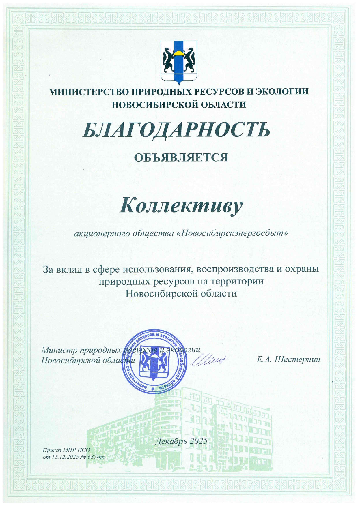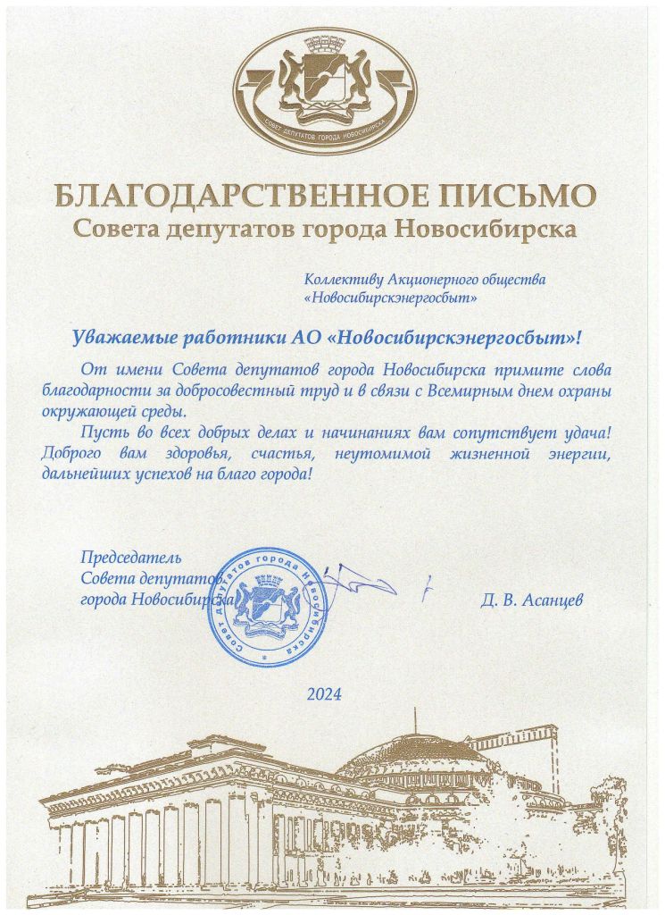 Благодарственное письмо коллективу АО "Новосибирскэнергосбыт" за участие корпоративных волонтёров во Всероссийских экологических акциях "Вода России" в рамках реализации нацпроекта "Экология"