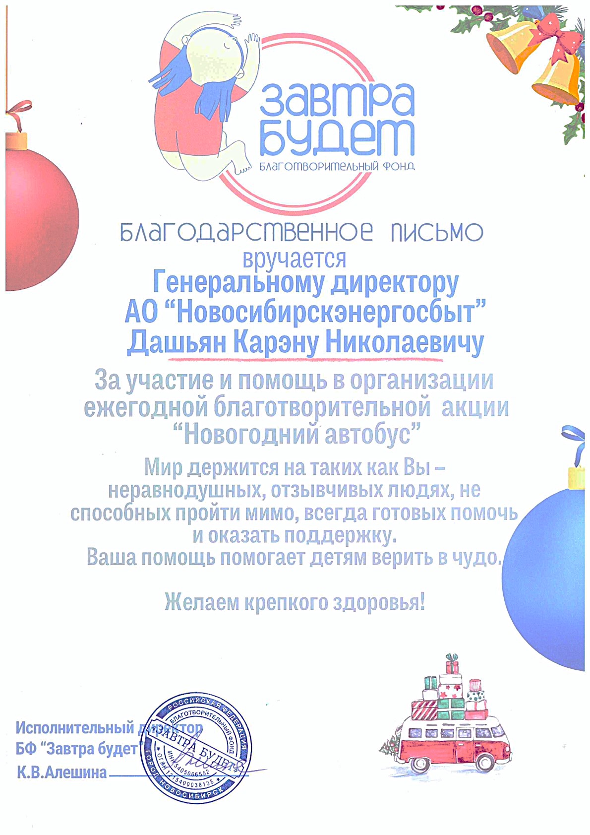 Благодарственное письмо за помощь и поддержку детей с онкологическим диагнозом Генеральному Директору АО "Новосибирскэнергосбыт" Дашьяну Карэну Николаевичу