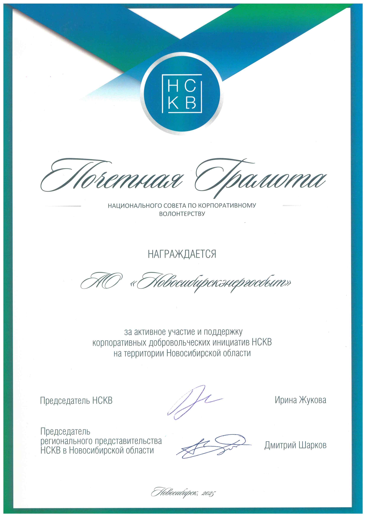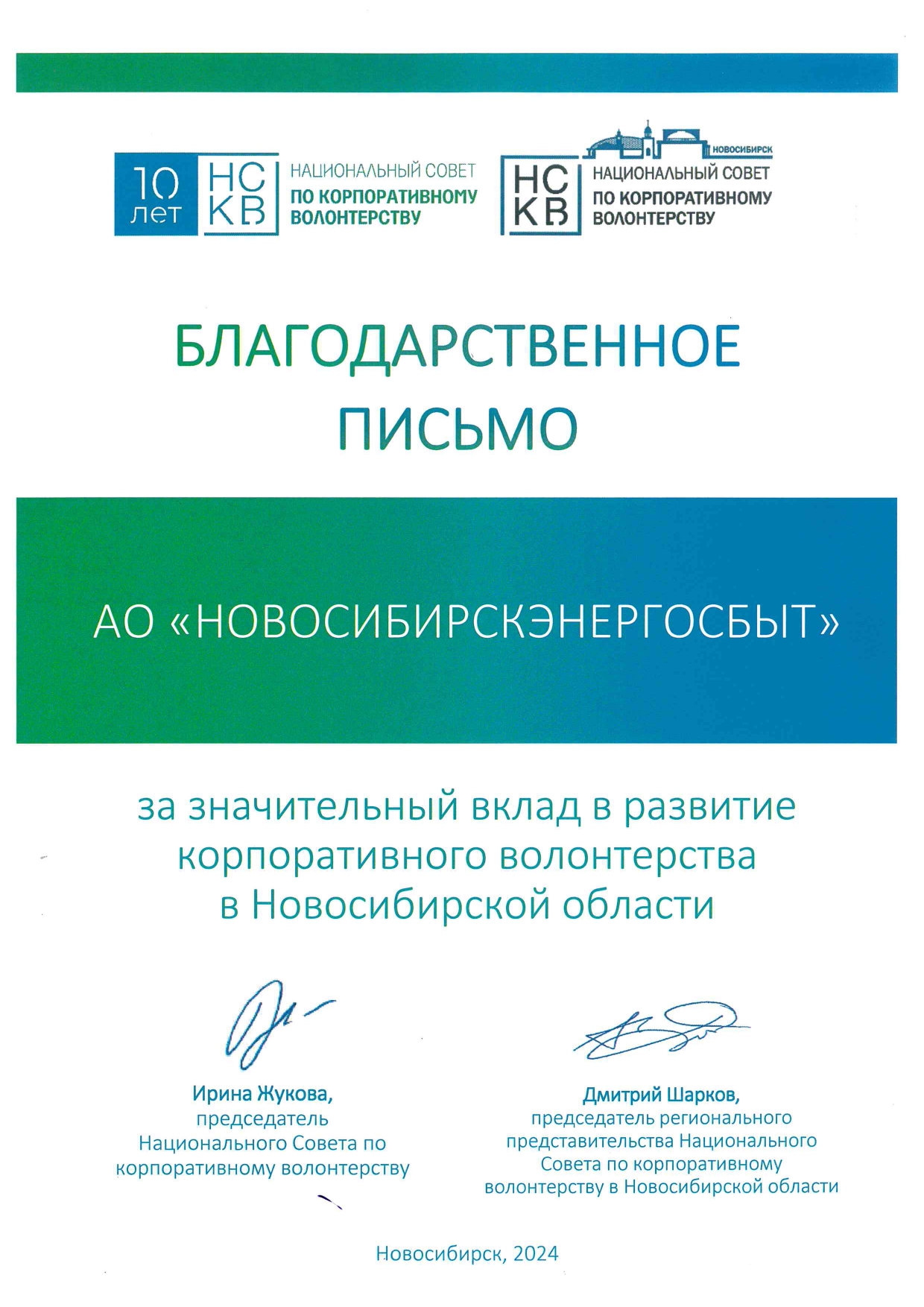Благодарственное письмо от НСКВ за значительный вклад в развитие корпоративного волонтёрства в Новосибирской области