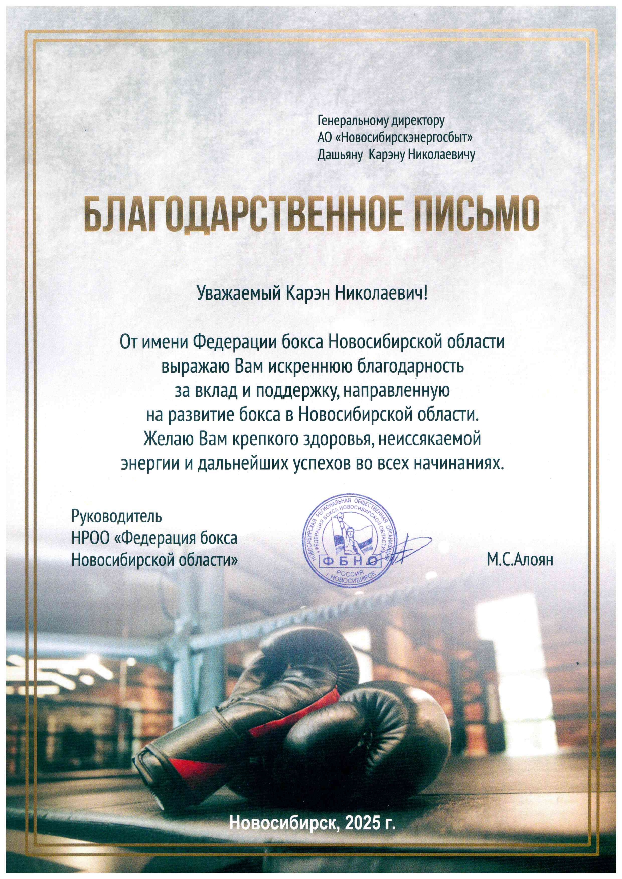 Благодарственное письмо от Федерации бокса за вклад и поддержку, направленную на развитие бокса Новосибирской области