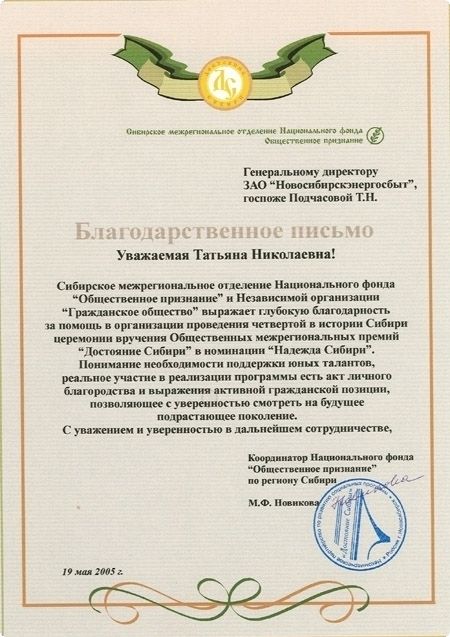 Благодарственное письмо Сибирского межрегионального отделения Национального фонда «Общественное признание»